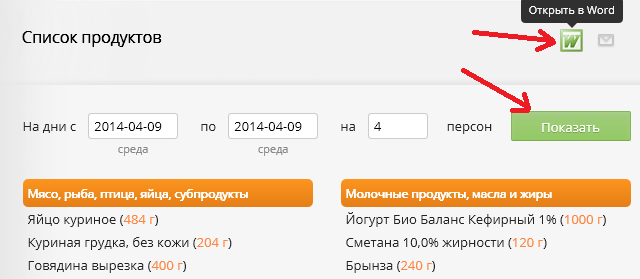 4 Нажмите на кнопку «Список продуктов», расположенную в левой части блокнота под календариком. Задайте дату и количество едоков, нажмите кнопку «Показать».