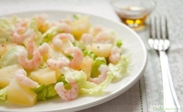 креветки очищенные, ананас, сметана 10,0% жирности, петрушка, салат, винный уксус 3%, масло оливковое