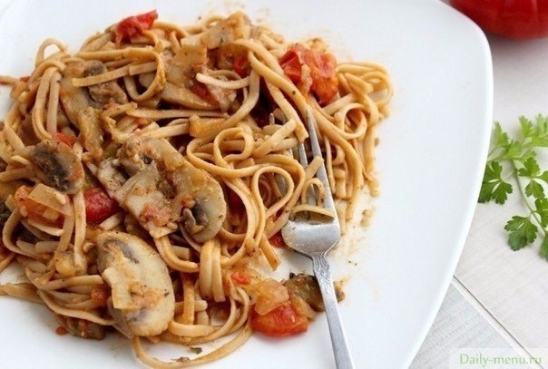 паста (спагетти), шампиньоны, перец красный сладкий, лук репчатый, соевый соус, чеснок, масло оливковое