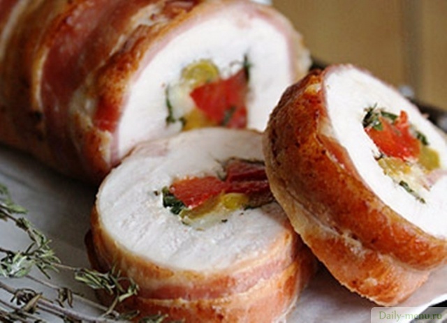 курица филе, без кожи, перец сладкий, бекон, сыр плавленный