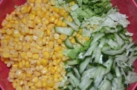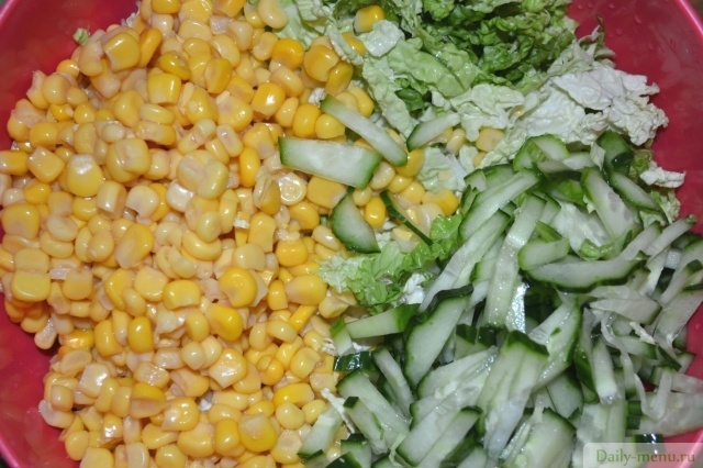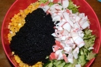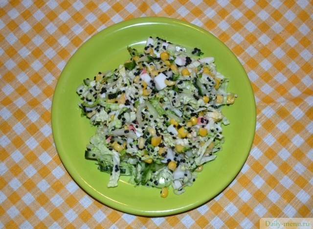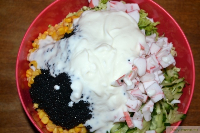 капуста пекинская, кукуруза консервы, крабовые палочки, огурец грунтовый, икра из морских водорослей, йогурт 1,5% , соевый соус, перец черный молотый