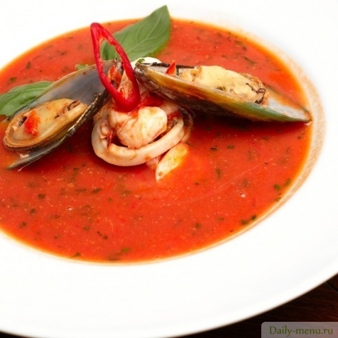 вода, сок томатный, осьминог, яйцо куриное, кальмар (мясо), помидоры, лук репчатый, креветки очищенные, морковь, мидии, перец сладкий, чеснок, сок лимонный, масло оливковое, укроп и другие пряные травы, шафран, приправа kamis прованские травы