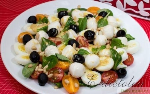 сыр моцарелла, яйцо перепелиное, помидоры черри, салат, маслины средние и мелкие, кедровый орех, масло оливковое, сок лимонный, горчица столовая, соль поваренная пищевая
