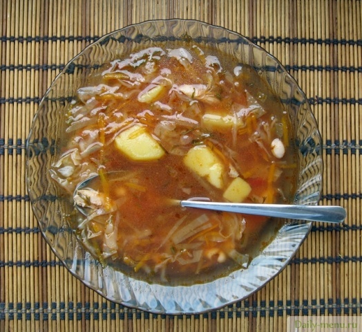 вода питьевая, капуста белокочанная, картофель, фасоль стручковая, свекла, морковь, томатная паста, масло подсолнечное, укроп и другие пряные травы