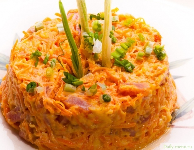 морковь, курица филе, без кожи, орех грецкий, лук зеленый, майонез