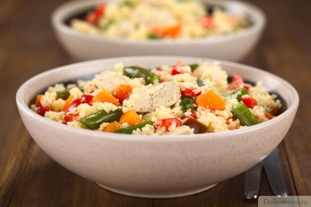овощной бульон, курица филе, без кожи, кус-кус, перец болгарский красный, фасоль стручковая, лук репчатый, вода, морковь, масло сливочное 72%, соль поваренная пищевая