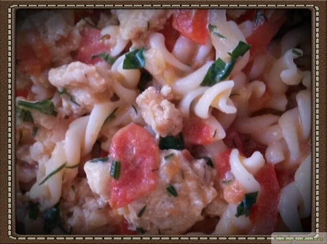 помидоры, фарш из курицы, фарш из курицы, жирный, перец болгарский красный, макароны из муки в/с, лук репчатый, сливки, 10,0% жирности, сметана 15,0% жирности, масло топленое, соль поваренная пищевая, укроп обыкновенный, петрушка