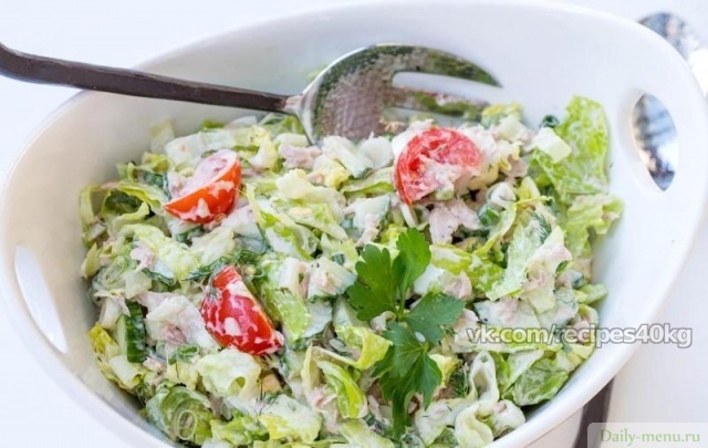 тунец натуральный консервы, помидоры, огурец грунтовый, салат, яйцо куриное, йогурт натуральный 2%, лук зеленый, укроп обыкновенный, петрушка, соль поваренная пищевая
