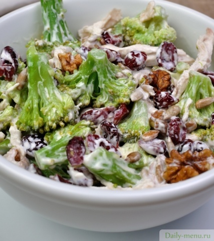 брокколи, бекон, лук репчатый, майонез , изюм, орех грецкий