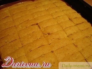 4. Горячий корж разрезать на небольшие палочки. Оставить охлаждаться.