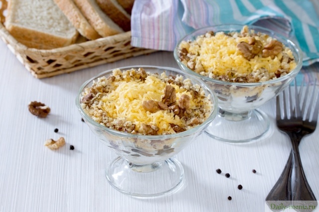 свинина вырезка, картофель, яйцо куриное, сыр голландский, майонез , шампиньоны, морковь, чернослив, орех грецкий