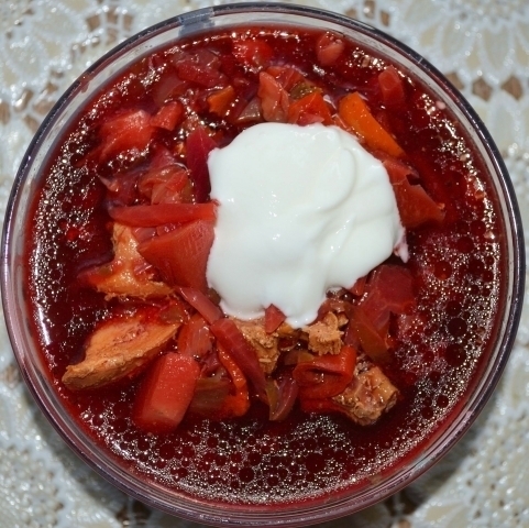 вода, куриная грудка, без кожи, свекла, морковь, капуста белокочанная, картофель, лук репчатый, помидоры, чеснок