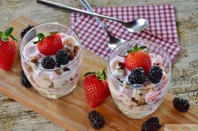 земляника, клубника, йогурт натуральный 2%, печенье овсяное, сахарная пудра