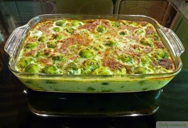 капуста брюссельская, яйцо куриное, сметана 10,0% жирности, бекон, сыр голландский, масло топленое, укроп и другие пряные травы
