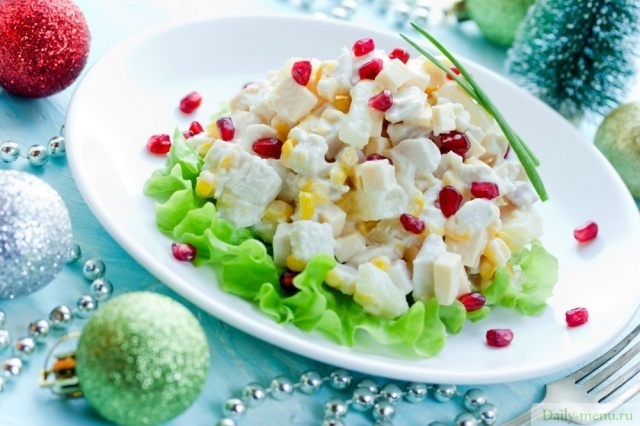 куриная грудка, без кожи, ананас консервированный, кукуруза консервы, сыр голландский, гранат, майонез