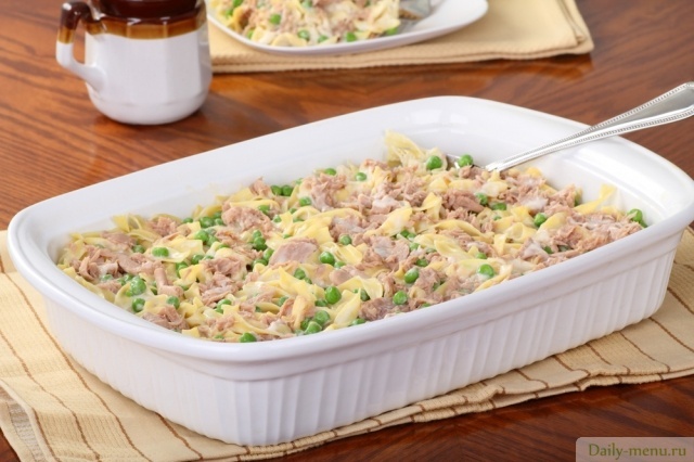 тунец натуральный консервы, вода, горошек зеленый, макаронные изделия яичные, сыр пармезан, яйцо куриное, лук репчатый, сливки, 10,0% жирности, масло оливковое, соль поваренная пищевая, перец черный молотый