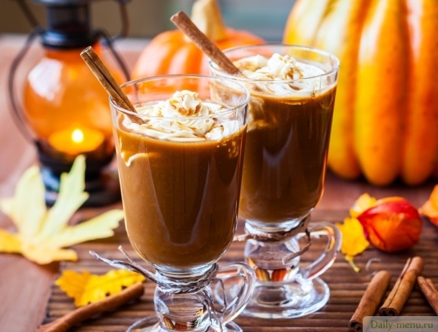 молоко 2,5% , вода, тыква, сливки 30% жирности, кофе натуральный молотый, ванильный сахар, корица, имбирь порошок, орех мускатный