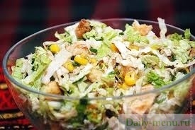 капуста пекинская, кукуруза консервы, огурец грунтовый, курица филе, без кожи, сухарики из белого хлеба