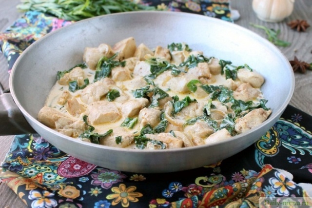 курица филе, без кожи, сметана 10,0% жирности, шпинат, масло оливковое, чеснок, перец черный молотый, соль поваренная пищевая