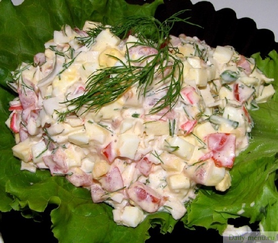 майонез , кукуруза консервы, крабовые палочки, рис белый, яйцо куриное, огурец грунтовый, помидоры, лук репчатый, чеснок, перец черный молотый