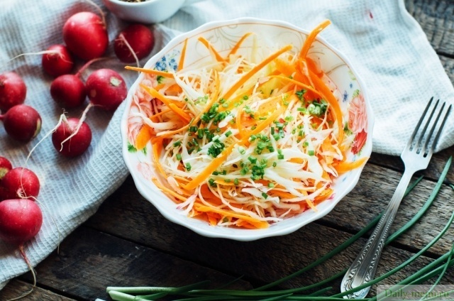 морковь, дайкон (японская редька), капуста белокочанная, масло оливковое, кунжут-семя, лук зеленый, соль поваренная пищевая