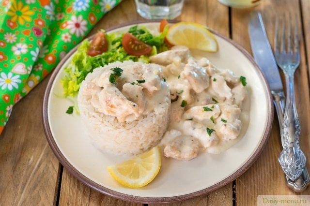 курица филе, без кожи, сливки, 10,0% жирности, лук репчатый, масло оливковое, мука пшеничная