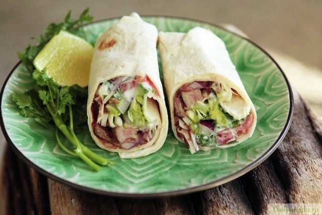 огурец маринованный, говядина вареная, помидоры, тортилья, салат, чесночный соус с йогуртом, лук репчатый