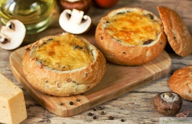 шампиньоны, хлеб пшеничный, сметана 18% жирности, лук репчатый, сыр костромской, топленое масло, соль поваренная пищевая, перец черный молотый