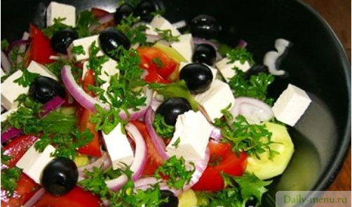 помидоры, огурец грунтовый, перец болгарский красный, брынза из коровьего молока, лук репчатый, маслины средние и мелкие, салат листвой зелёный, масло оливковое, сок лимонный, соль поваренная пищевая, перец черный молотый