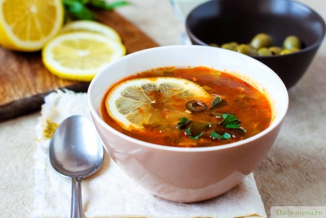 вода, картофель, капуста белокочанная, огурец соленый, маслины средние и мелкие, рассол огуречный, лук репчатый, морковь, масло оливковое, томатная паста, лимон, щавель