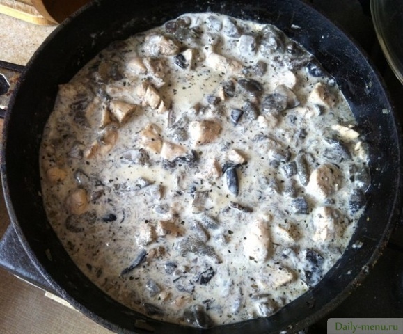 шампиньоны, куриная грудка, без кожи, лук репчатый, сметана 10,0% жирности, масло подсолнечное, соль поваренная пищевая