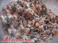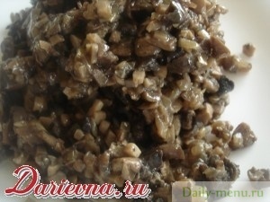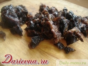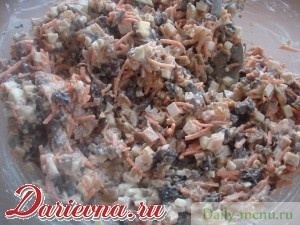 шампиньоны, куриная грудка, копченая, лук репчатый, сметана 10,0% жирности, яйцо куриное, морковь корейская, укроп и другие пряные травы, чернослив, масло оливковое