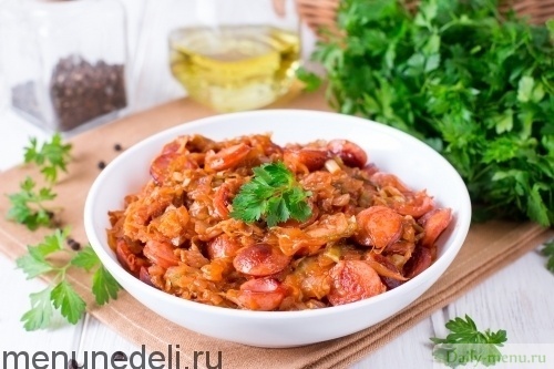 капуста белокочанная, сосиски молочные, томатная паста, лук репчатый, масло сливочное 72%, соль поваренная пищевая, вода, чеснок, перец черный молотый
