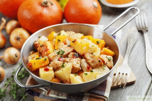 курица филе, без кожи, картофель, тыква, вода, лук репчатый, масло топленое, лук зеленый, тимьян, соль поваренная пищевая, куркума, орех мускатный