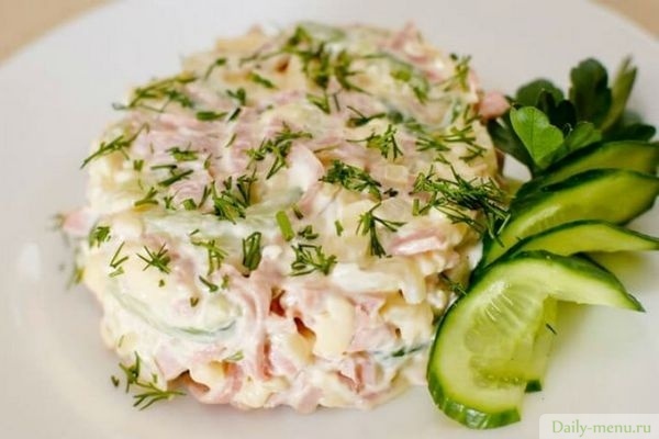 ветчина особая, сыр гауда, яйцо куриное, огурец грунтовый, майонез , укроп и другие пряные травы, чеснок