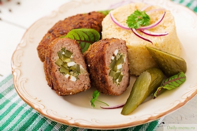 фарш из говядины, огурец соленый, лук репчатый, яйцо куриное, сухари панировочные, масло оливковое, батон нарезной, лук зеленый, соль поваренная пищевая