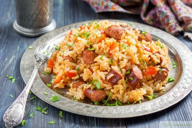 куриный бульон, рис длиннозёрный, куриные бедра без кожи, помидоры, охотничьи колбаски, перец сладкий, лук репчатый, сельдерей черешковый, чеснок, соль поваренная пищевая, паприка сушёная, молотая, орегано сушеный, тимьян, перец черный молотый, перец красный молотый