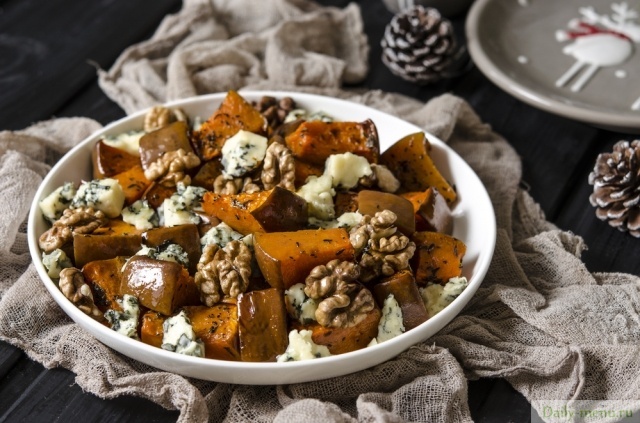 тыква, сыр дор блю, орех грецкий, масло оливковое, перец чили, сок лимонный, цедра лимонная, соль поваренная пищевая, тимьян