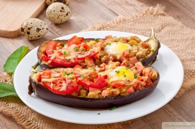 баклажаны, помидоры, ветчина в форме, сыр голландский, яйцо перепелиное, масло оливковое, укроп и другие пряные травы, соль поваренная пищевая, перец черный молотый