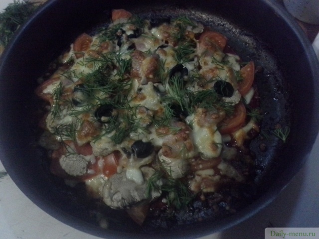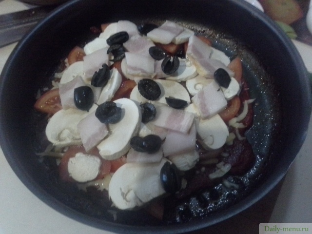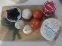 фарш из говядины, помидоры, шампиньоны, сыр моцарелла, яйцо куриное, маслины крупные, бекон, томатная паста, укроп и другие пряные травы, масло топленое