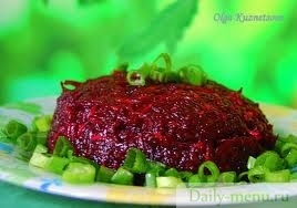 свекла отварная, чеснок, масло оливковое, укроп обыкновенный, лук зеленый, соль поваренная пищевая
