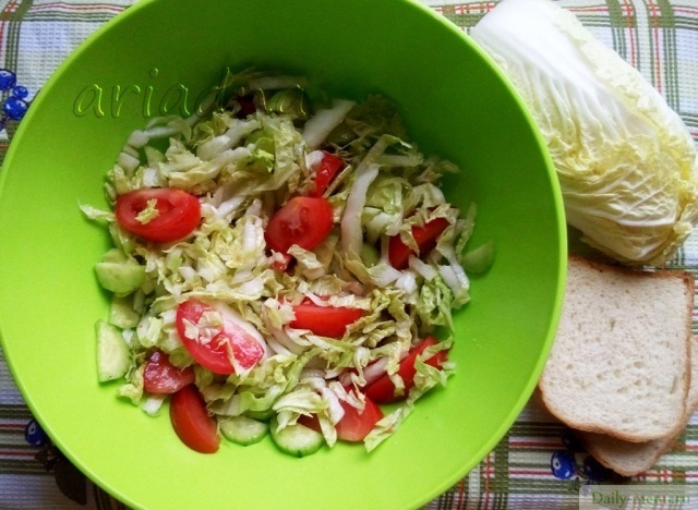 капуста пекинская, перец болгарский красный, огурец грунтовый, помидоры, соль поваренная пищевая, уксус 9%, масло оливковое