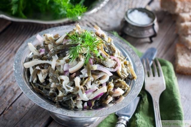 кальмар (мясо), морская капуста консервы, яйцо куриное, майонез , лук репчатый, соль поваренная пищевая