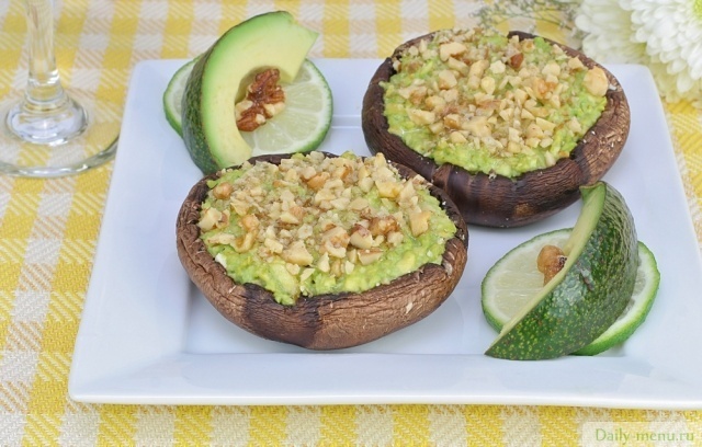 шампиньоны, авокадо, орех грецкий, сок лайма, соль поваренная пищевая, красный острый перец