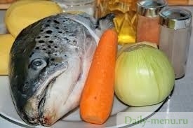 семга, картофель, лук репчатый, пшено, перец черный горошек, лавровый лист