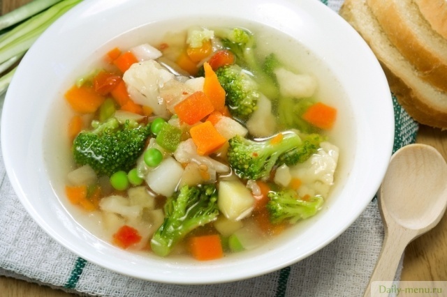 вода, морковь, пастернак, лук репчатый, масло подсолнечное, брокколи, чеснок, перец черный молотый