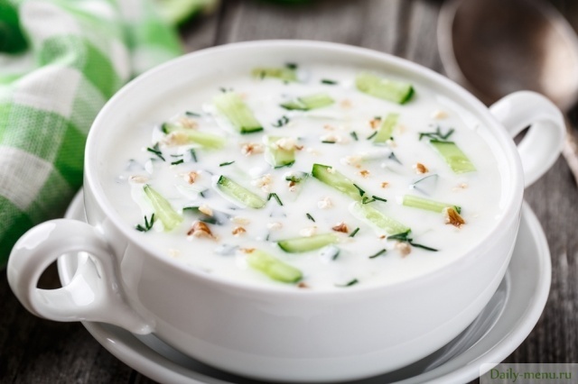 вода, яйцо куриное, огурец грунтовый, сметана 25% жирности, бекон, укроп и другие пряные травы, соль поваренная пищевая
