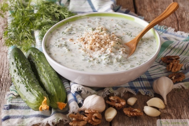 айран (тан) газированный, огурец грунтовый, яйцо куриное, орех грецкий, укроп и другие пряные травы, соль поваренная пищевая
