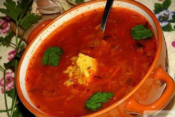 вода, куриная грудка, без кожи, лук репчатый, рис белый, морковь, томатная паста, масло подсолнечное, чеснок, укроп и другие пряные травы, соль поваренная пищевая