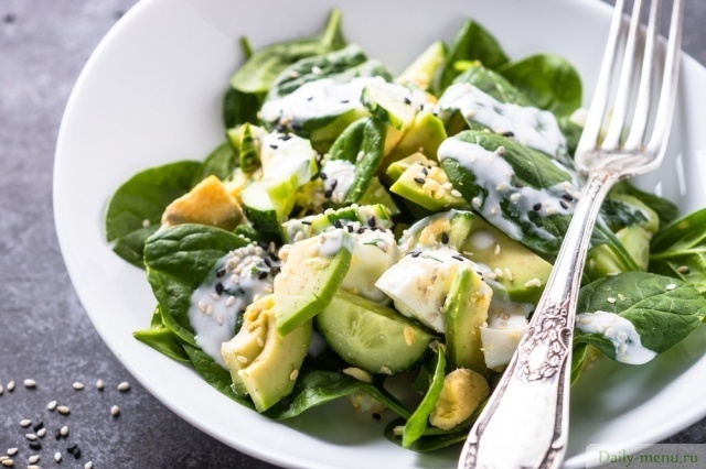 авокадо, огурец грунтовый, яйцо куриное, сметана 25% жирности, шпинат, вода, кунжут-семя, сок лимонный, соль поваренная пищевая